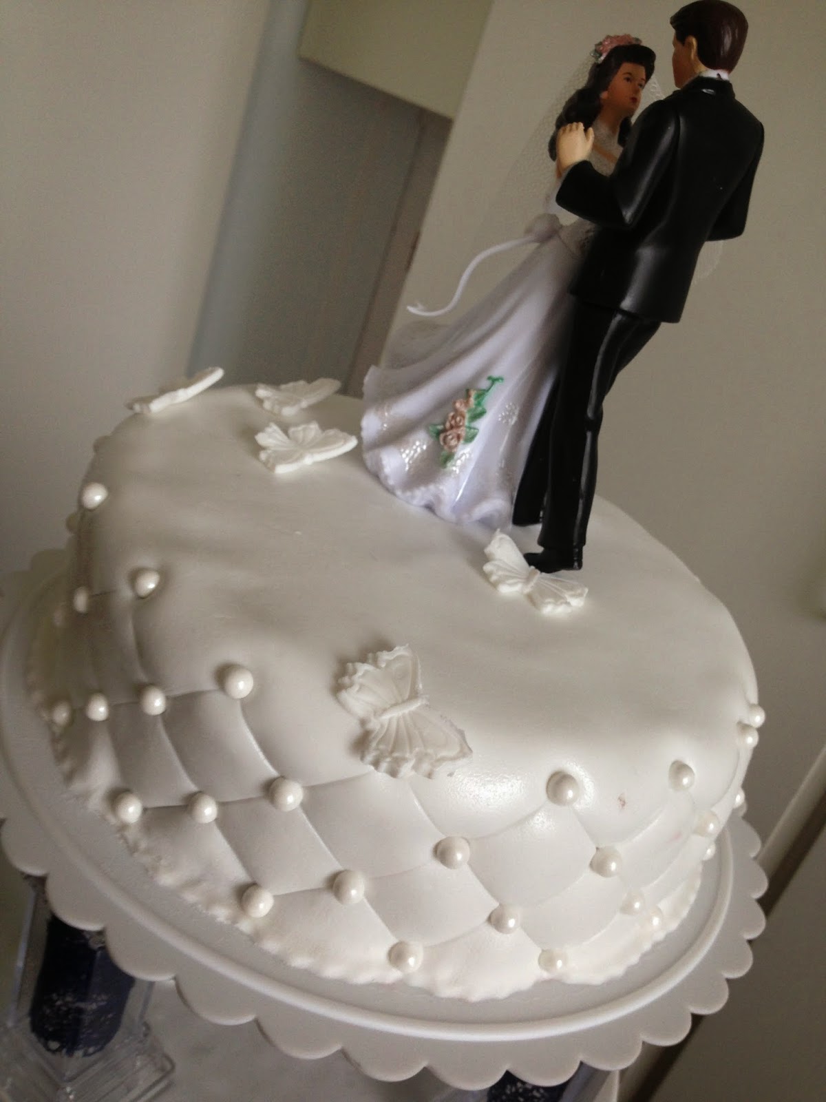 I dag publiserer jeg den siste bryllupskaken jeg har laget. Kaken ble ikke montert før på kvelden, så bildene er litt dårlige mobilbilder dessverre. Denne gangen var det en ny måte å bygge den opp på for min del, og jeg synes det gikk ganske greit. Noen forbedringer kunne det alltids vært, men disse tar jeg med meg videre til neste gang :- )